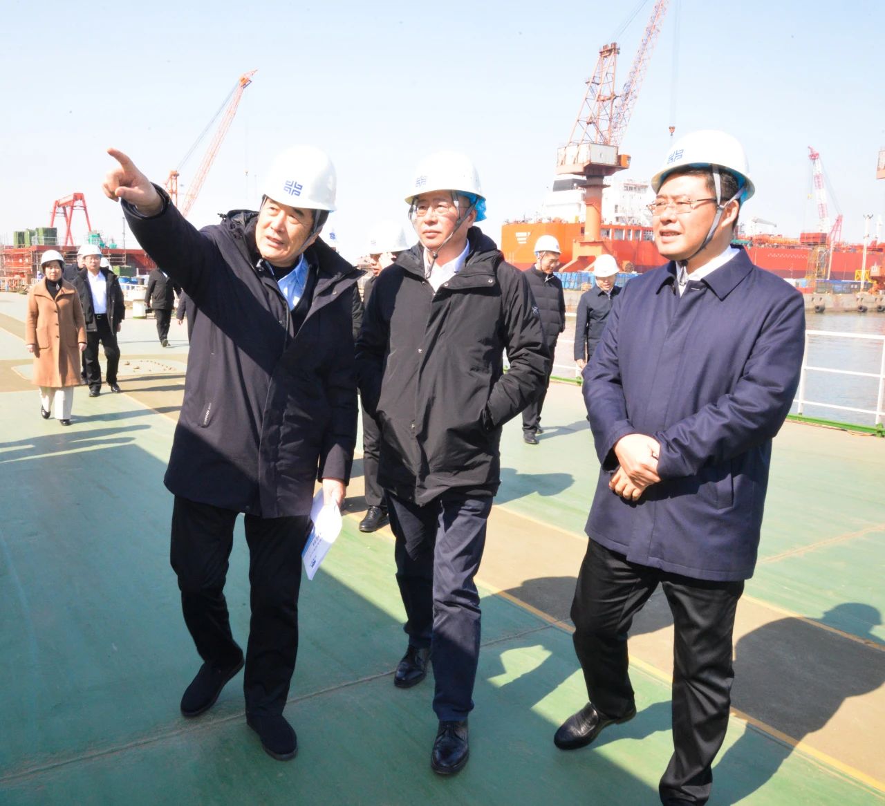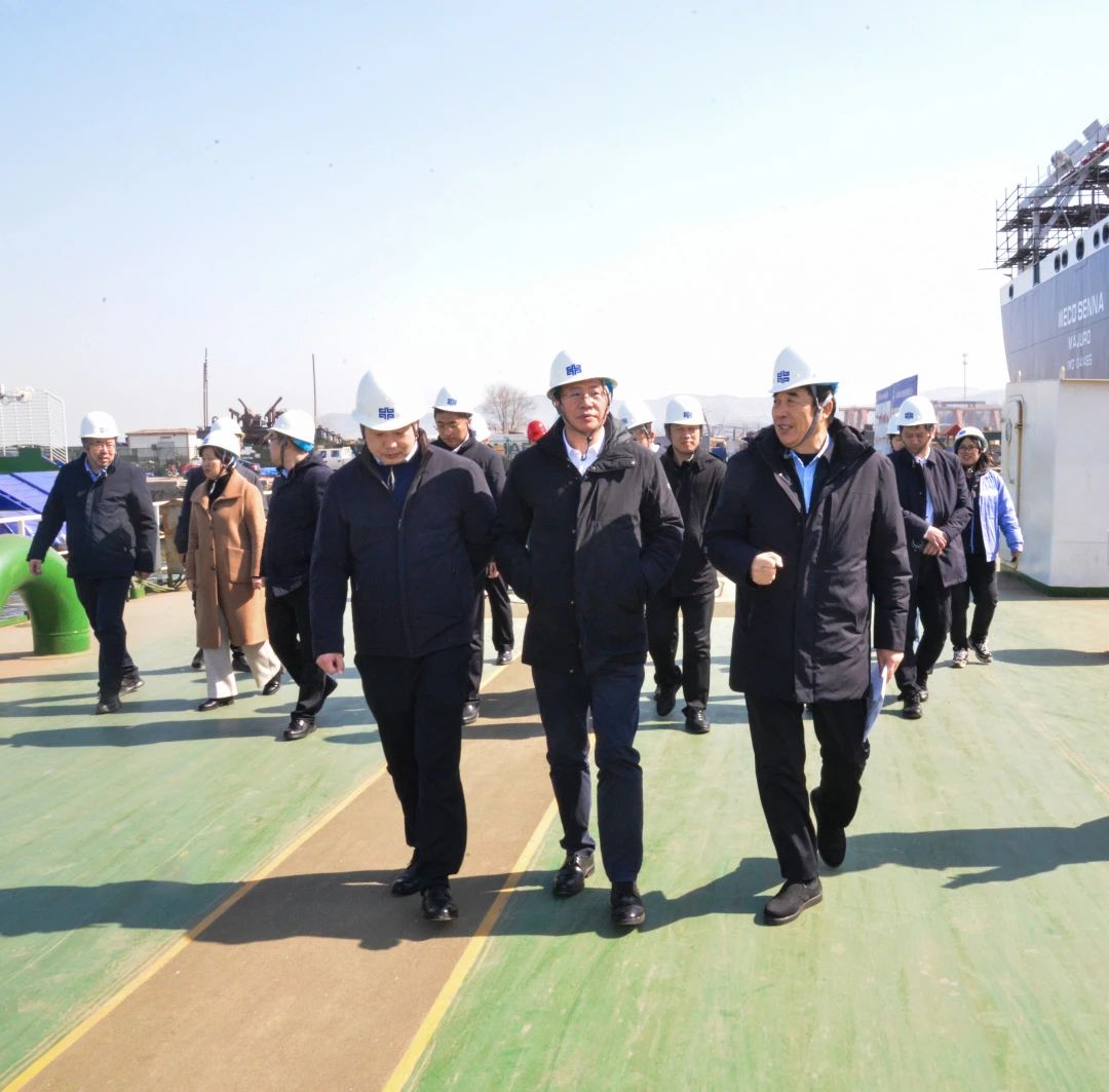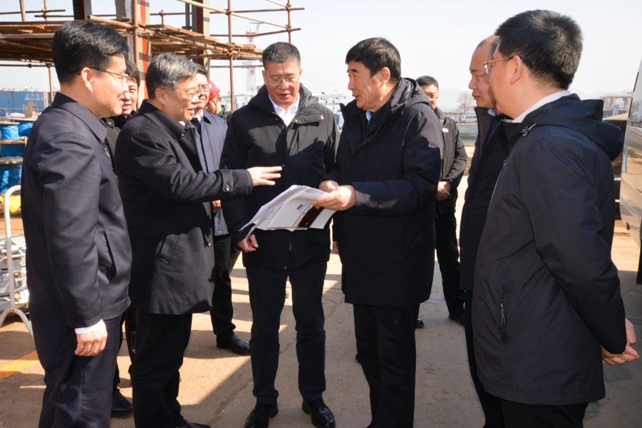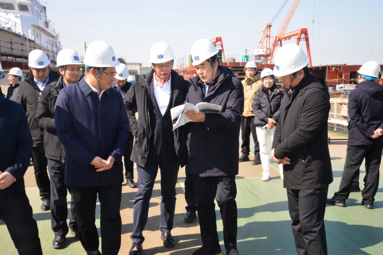 On February 26, 2025, Li Feng, the Director of the Shandong Provincial Department of Finance, along with his delegation, visited Jinglu Shipyard for a research visit, accompanied by Sun Fuxun, the Director of the Yantai Municipal Finance Bureau. Lin Yutao, the Vice Mayor of Yantai City and Secretary of the Penglai District Party Committee, Wang Changgang, the Governor of Penglai District, Tian Wenliang, the Deputy Mayor of Penglai District, Si Junqiang, the Director of the District Finance Bureau, Wei Zhaoguo, the Party Secretary of Beigou Town, as well as relevant leaders from Jinglu Shipyard accompanied the investigation.
