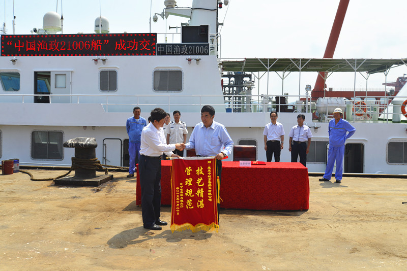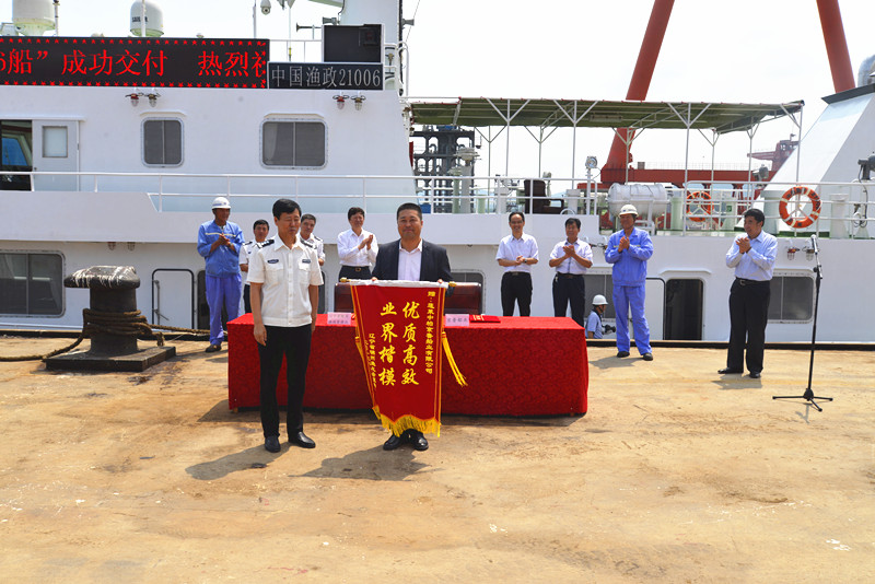 2015年6月20日,在京魯船廠碼頭舉行了遼寧省錦州漁政管理局300噸漁政船—“中國(guó)漁政21006船”的簽字交船儀式,出席此次儀式的有遼寧省海洋與漁業(yè)廳荊南進(jìn)副廳長(zhǎng);遼寧省錦州漁政管理局侯成平局長(zhǎng)、潘永斌副局長(zhǎng)、李樹(shù)旺副局長(zhǎng)、張旭處長(zhǎng)、趙斌副處長(zhǎng)、及21006船的船長(zhǎng)謝曉峰與輪機(jī)長(zhǎng)喬彪、駐廠代表;山東漁檢龍口分局董鳳桂副支隊(duì)長(zhǎng);蓬萊市政府吳明光副市長(zhǎng);蓬萊市海洋與漁業(yè)局翟德強(qiáng)副局長(zhǎng);京魯船業(yè)王轟董事長(zhǎng)、于以龍副總經(jīng)理、王強(qiáng)副總經(jīng)理。